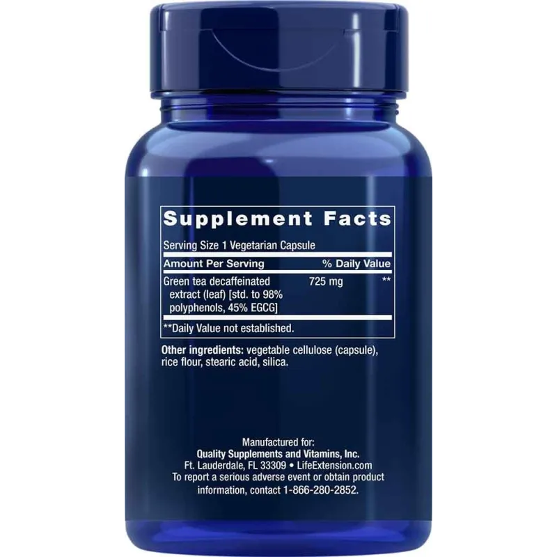 Μία κάψουλα του Εκχυλίσματος Πράσινου Τσαγιού Mega της Life Extension παρέχει περισσότερες πολυφαινόλες από ό,τι θα λάβατε από την κατανάλωση επτά φλιτζανιών πράσινου τσαγιού. Αυτό το εκχύλισμα πράσινου τσαγιού είναι τυποποιημένο σε 98% πολυφαινόλες και περιέχει 326,25 mg EGCG, με διαφορά την πιο σημαντική πολυφαινόλη που παρέχει το πράσινο τσάι.