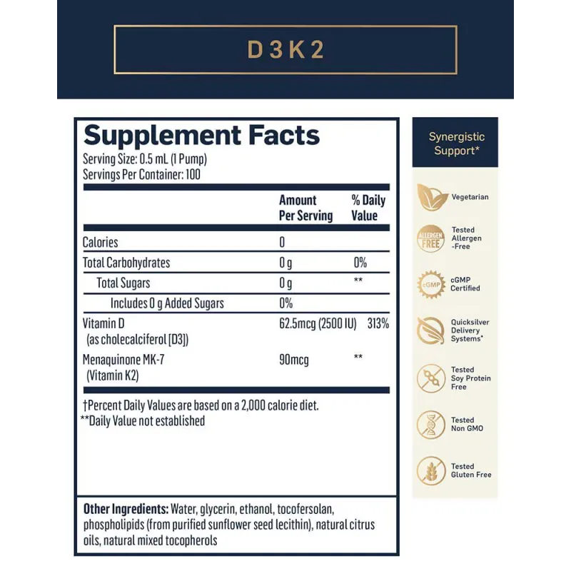 Αν και μικρές ποσότητες βιταμίνης D2 βρίσκονται σε τροφές όπως ο κρόκος αυγού, τα αμύγδαλα, ο σολομός και το τυρί, η μορφή βιταμίνης D3 είναι έως και δέκα φορές πιο αποτελεσματική από τη D2 στην αύξηση του 25(OH)D - η κύρια κυκλοφορούσα μορφή βιταμίνης D στο σώμα. Η βιταμίνη K2 συνεργάζεται αρμονικά με τη βιταμίνη D και μπορεί να μειώσει τις επιβλαβείς εναποθέσεις ασβεστίου στις αρτηρίες, τους νεφρούς, τις αρθρώσεις και τους μαλακούς ιστούς. Η βιταμίνη K2 μπορεί επίσης να βοηθήσει τη βιταμίνη D να διατηρήσει τα οστά μας δυνατά. Η φόρμουλα Quicksilver περιέχει μια υψηλής βιοδραστικότητας μορφή βιταμίνης K2 που ονομάζεται μενακινόνη-7 ή MK-7. Διαθέτει μεγάλη ημίσεια ζωή, η οποία συνδέεται με σταθερά επίπεδα στον ορό.