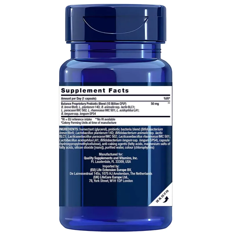 | Ingredients: Probiotic bacteria blend (Bifidobacterium breve Bbr8; Lactobacillus plantarum 14D; Bifidobacterium animalis ssp. lactis BLC1; Lacticaseibacillus paracasei IMC 502; Lacticaseibacillus rhamnosus IMC 501; Lactobacillus acidophilus LA1; Bifidobacterium longum ssp. longum SP54), bulking agent (microcrystalline cellulose/cellulose gel), capsule (hydroxypropyl methyl cellulose), anti-caking agents (silicon dioxide [nano], magnesium salts of fatty acids) | |