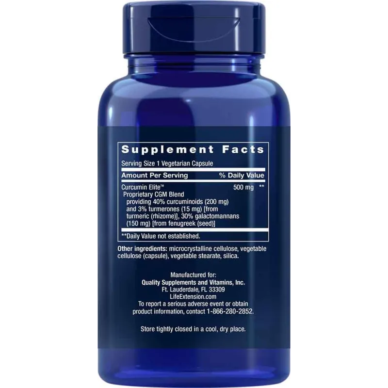 Curcumin Elite™ Proprietary CGM Blend Turmeric rhizome extract and oil providing 40% curcuminoids (200 mg) and 3% turmerones (15 mg), fenugreek seed fibers providing 30% galactomannans (150 mg) |