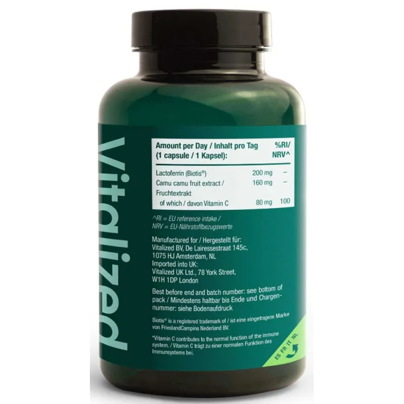 Vitalized Lactoferrin+ is an advanced formula supporting immunity, based on pure Biotis® lactoferrin and natural vitamin C from Camu Camu fruit. Contains the optimal clinical dose of 200 mg lactoferrin and 80 mg vitamin C in one capsule - no synthetics, no gluten, manufactured in Europe.