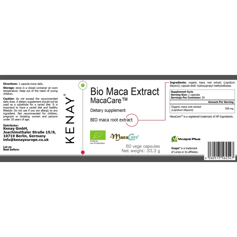 Ingredientes: extracto de raíz de maca orgánica (Lepidium Meyenii); cápsula: hidroxipropilmetilcelulosa. |