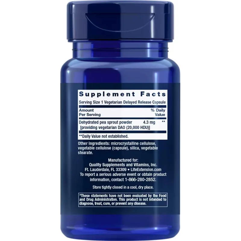Muchas fuentes de DAO suplementaria se derivan de riñones de cerdo. Pero nuestra fórmula proporciona DAO derivada de brotes de guisantes con una capacidad equivalente para descomponer la histamina, como se utiliza en estudios clínicos.