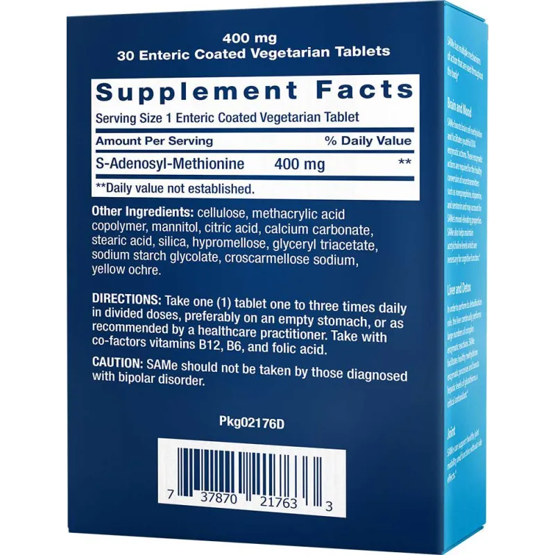 SAMe ayuda a mantener un estado de ánimo estable y la función articular sin efectos secundarios. Además, SAMe tiene múltiples mecanismos de acción que se utilizan en todo el cuerpo, especialmente en el hígado, que ayudan a mantener la salud del hígado. Conocido en gran medida por sus efectos sobre el estado de ánimo óptimo, SAMe también ha demostrado beneficios para el hígado, el cerebro y las articulaciones.
