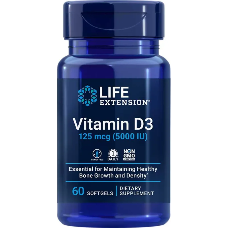 Este suplemento de vitamina D3 proporciona 5000 UI de vitamina D3 en forma de colecalciferol por cápsula blanda. Le sugerimos que se haga un análisis de sangre de 25-hidroxivitamina D después de 3 meses para evaluar y ajustar su dosis. Sus niveles sanguíneos óptimos deben ser de 50 a 80 ng/ml durante todo el año.