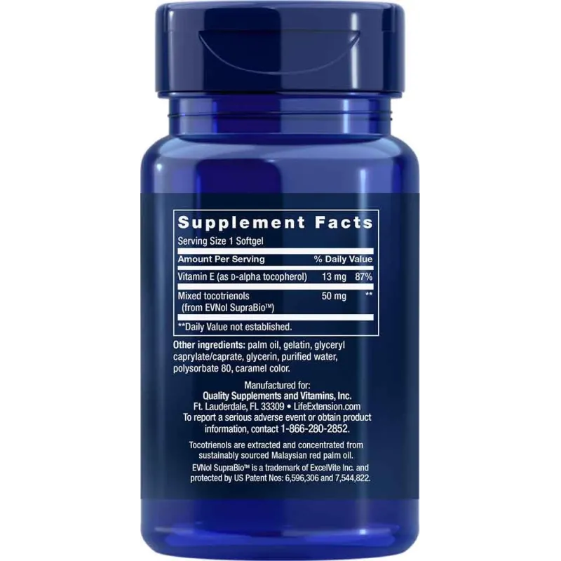 La mayoría de las personas no se dan cuenta de que la vitamina E contiene ocho compuestos diferentes. Los suplementos comerciales de vitamina E se enfocan en solo cuatro de estos compuestos llamados tocoferoles, mientras que en su mayoría omiten los cuatro tocotrienoles que son ricos en beneficios terapéuticos y antioxidantes.Tamaño de la porción: 1 cápsula blanda