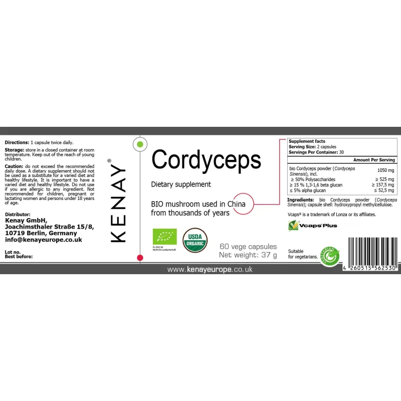 Ingrédients: Poudre de Cordyceps Bio (Cordyceps sinesis); enveloppe de la capsule: hydroxypropylméthylcellulose |