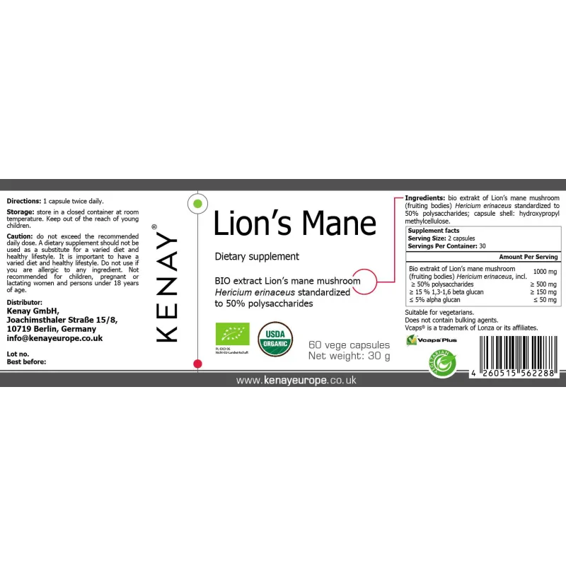 Ingredienti: estratto bio di Fungo Criniera di Leone (corpi fruttiferi) Hericium erinaceus titolato al 50% in polisaccaridi; involucro della capsula: idrossipropilmetilcellulosa. |